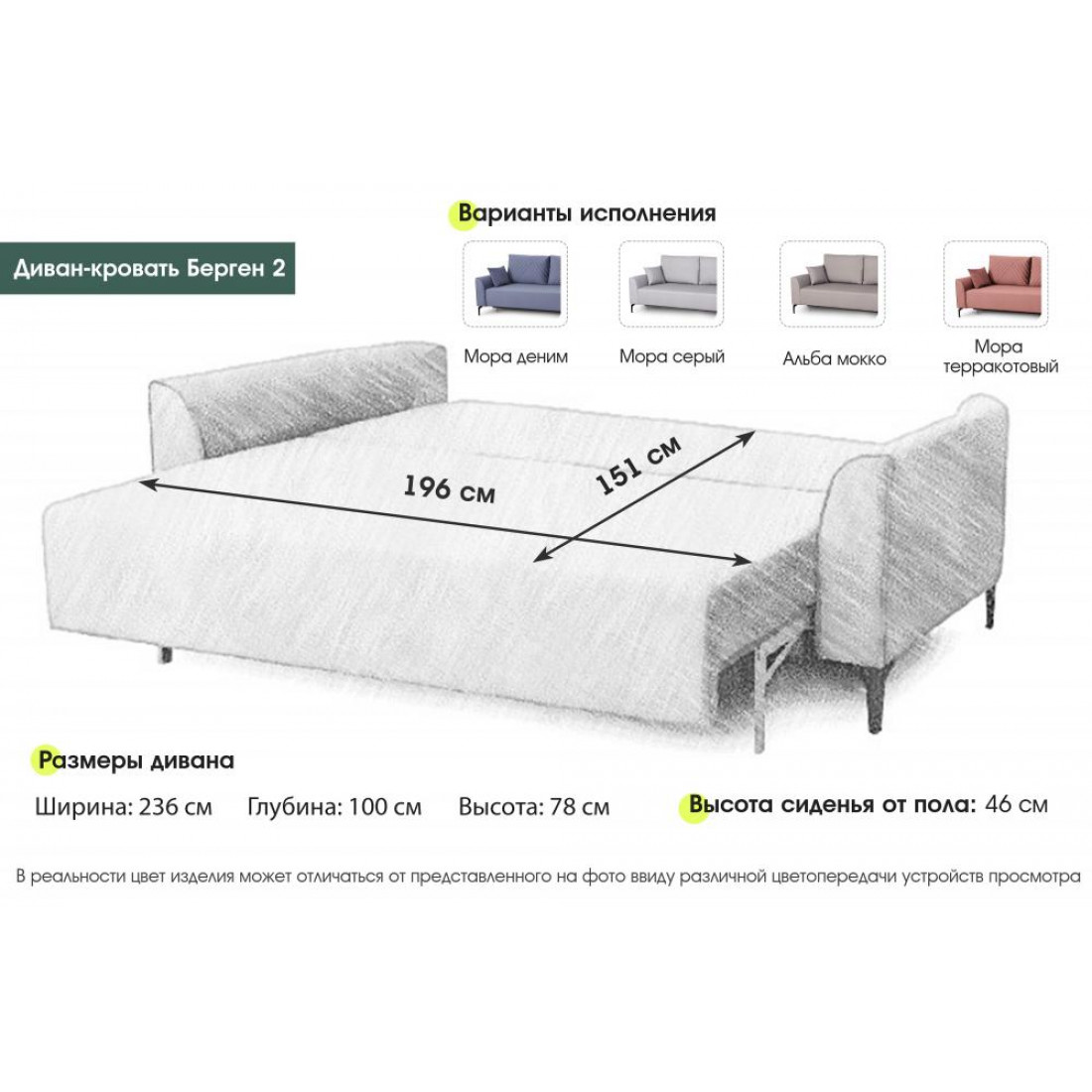 В основании спального места блок независимых пружин Pocket, пружины "змейка" и деревянная рама. В диване "Берген 2" имеется вместительный ящик для хранения.