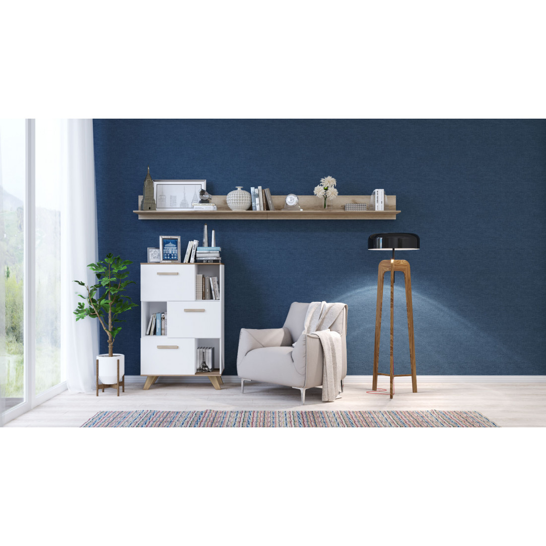 Набор мебели Вега Скандинавия украсит небольшую гостиную. Цвет гостиной соответствует скандинавскому стилю - сочетание природного оттенка древесины «Дуб каньон» с глянцевым белым цветом. В комплект входит удобный и низкий шкаф с дверцами и нишами для хранения и размещения предметов. Украшают композицию две навесные настенные полки