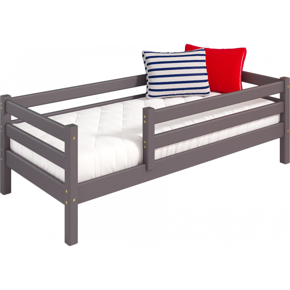 Кровать выполнена из массива дерева, может комплектоваться выкатными ящиками и аксессуарами из текстиля. Отделка выполнена эмалью AqaLAC с добавления красителя цвета "Лаванда".