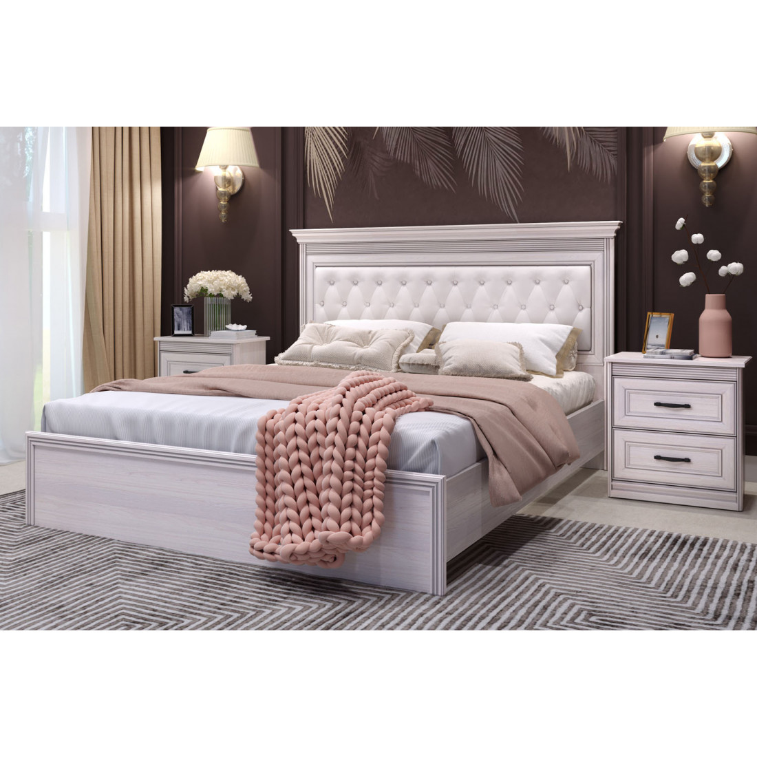 - «ясень анкор светлый» (патина серебро) + изголовье кровати экокожа «polo» белая.