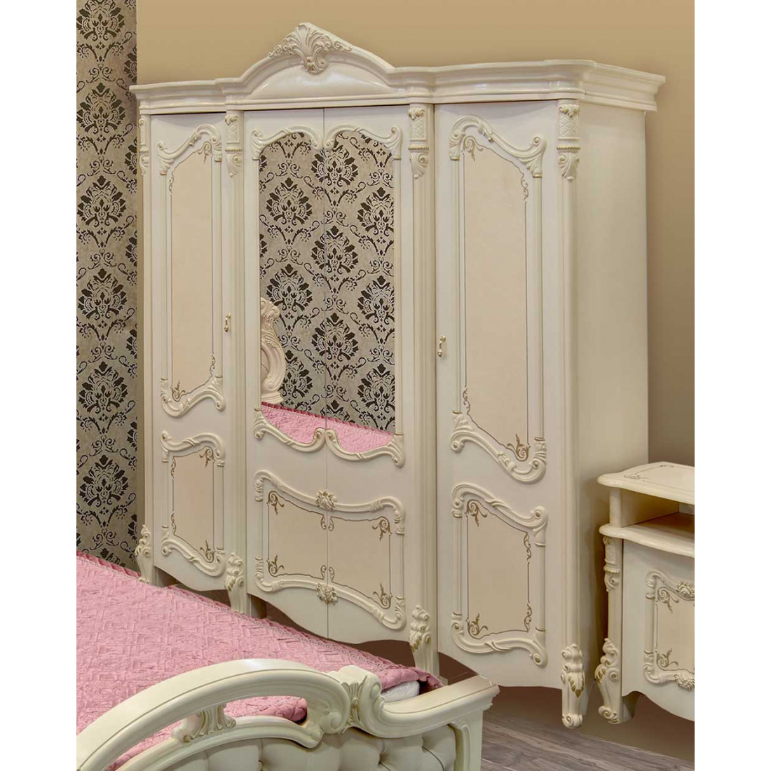 Спальня Рафаэлла от Российской фабрики «ДИА мебель», выполнена в элегантно нежном бежевом цвете. Такая спальня в сочетании с глянцевым покрытием и резной вставкой придаст незабываемую атмосферу роскоши. Большая комфортабельная кровать окунет Вас в незабываемый крепкий сон. Объемный четырехстворчатый шкаф поможет забыть о лишних вещах и сделать комнату многофункциональной. Большое зеркало визуально расширит пространство. Вся коллекция «Рафаэлла» предназначена для людей умеющих по достоинству оценить комфорт.