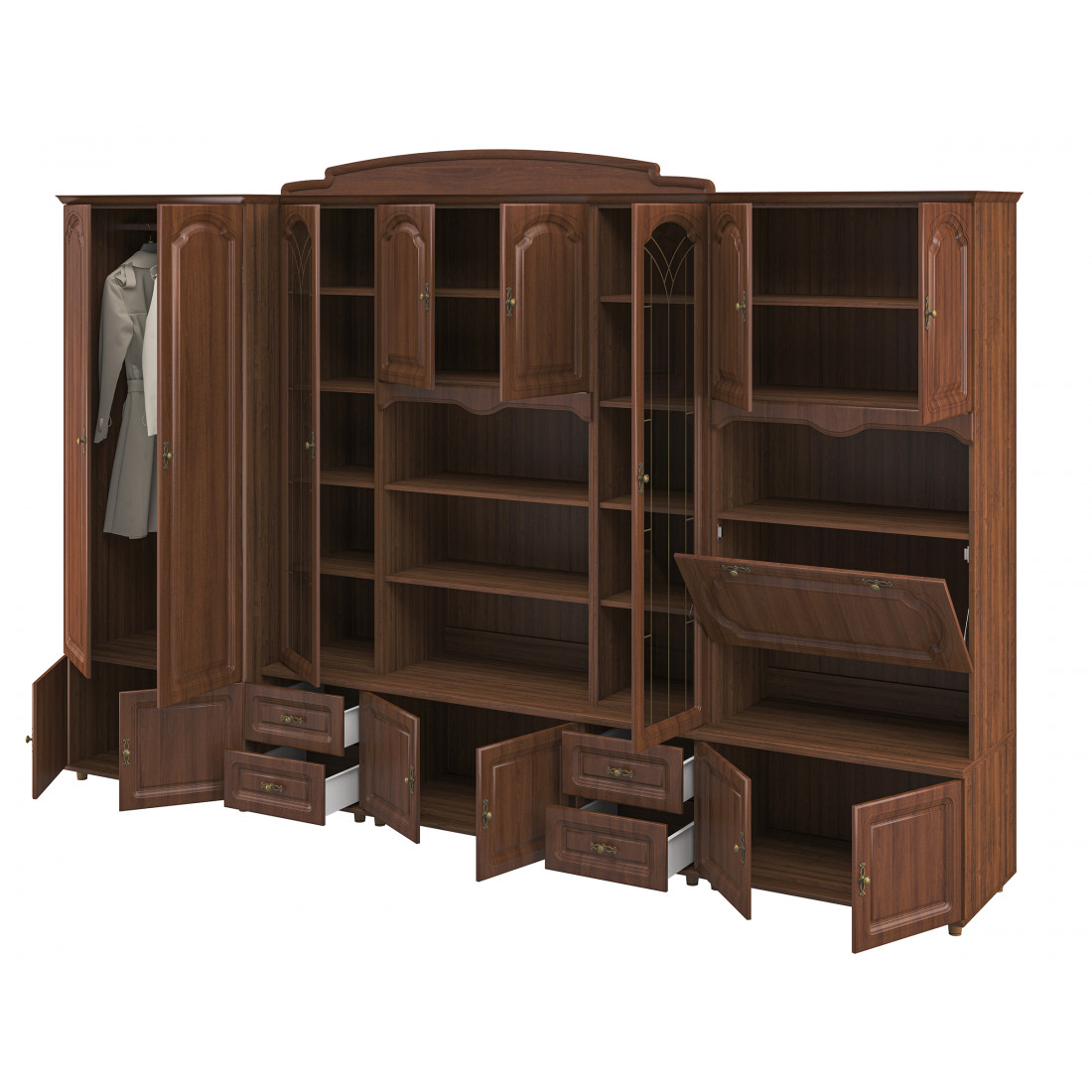 Стенка в гостиную "Романитка"  не устаревающая классика на все времена.Длина стенки 3240мм, высота 2180мм, глубина 610мм. Вместительный шкаф для одежды, закрытые полочки для белья, ящики для хранения вещей , ниша под ТВ . Многофункциональная, в классическом цвете "орех темный" стенка в гостиную "Романитка ВК-09.01"  отлично впишется в интерьер дома, квартиры, уютного коттеджа.